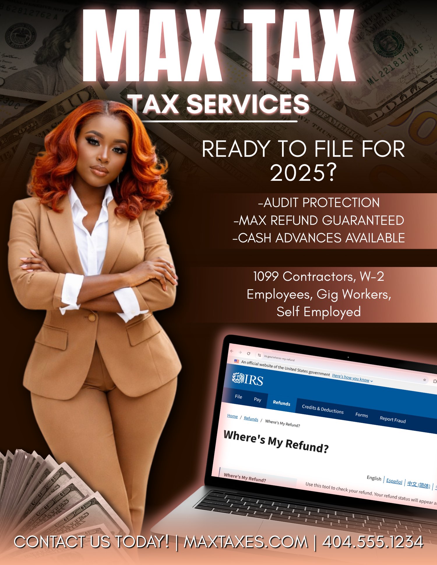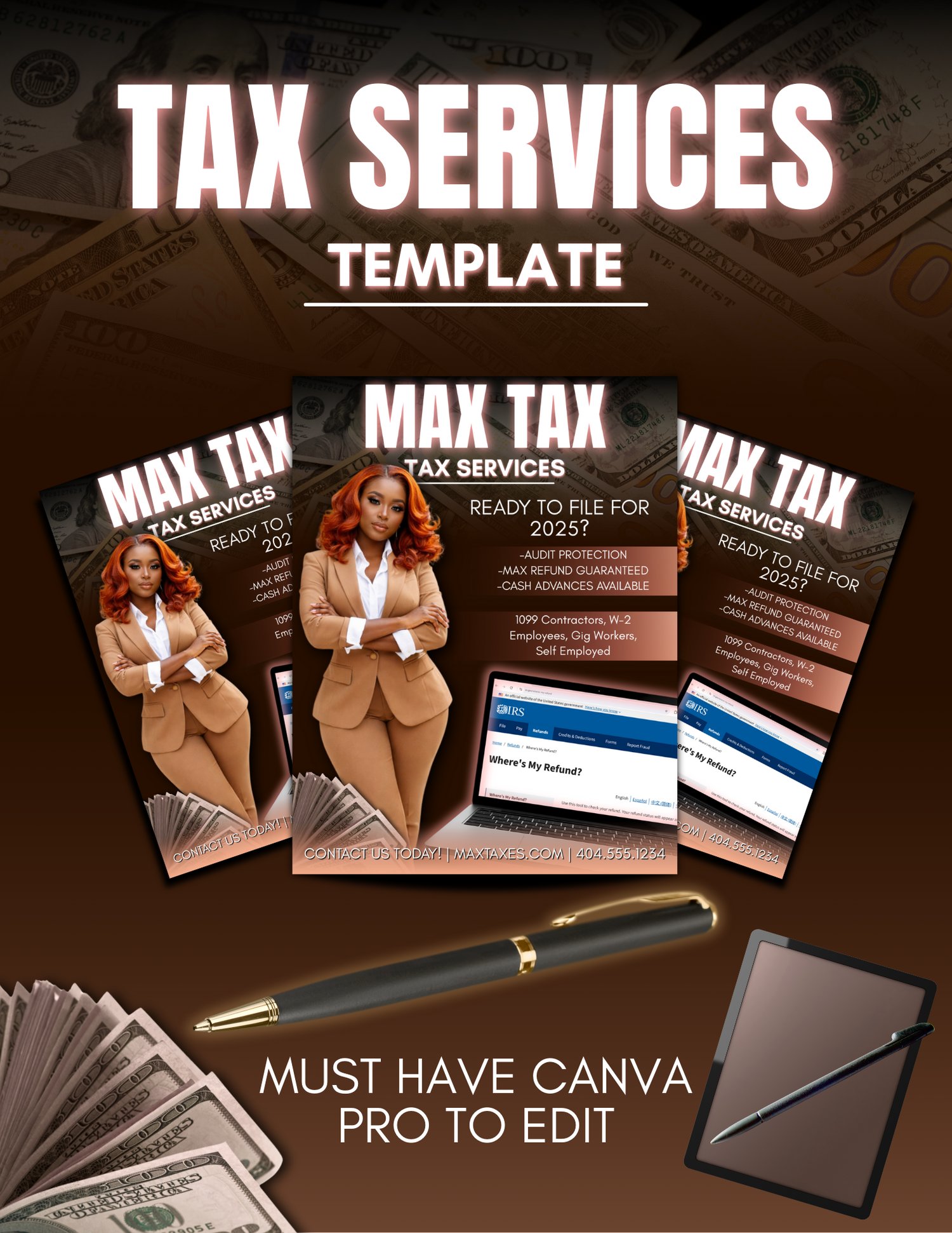 Editable booking flyer template for tax service providers. For use only in Canva. Not for resale. Must have Canva Pro to edit all elements.